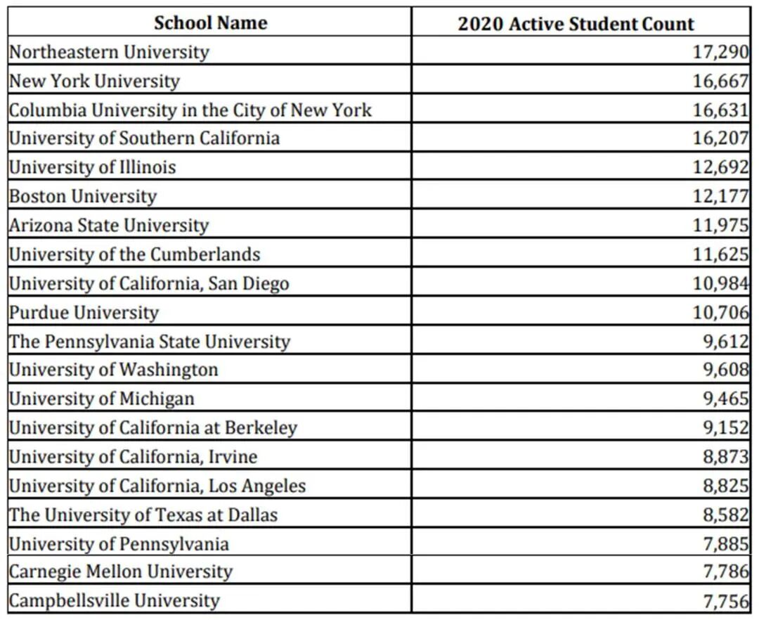 美国当地时间2021年3月19日,美国移民和海关执法局(ICE)发布2020年度国际学生和访问学者数据报告。让我们看看哪些学校的国际学生注册人数最多。