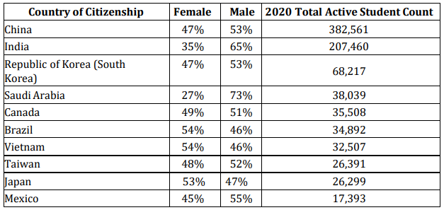 根据数据,中国是美国最大留学生来源国,共382,561名留学生,接近国际学生总数的三分之一。在这些中国留学生中,男生和女生的比例分别为53%和47%。男生数量超过女生。